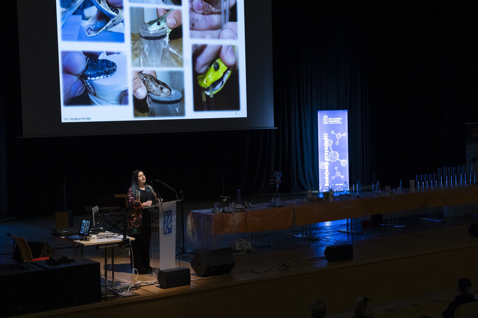 Po oficjalnym otwarciu seminarium i prezentacji Wydziału Chemicznego, uczestnicy mieli okazję wysłuchać niezwykle inspirujących wykładów naukowców Politechniki Rzeszowskiej. Pierwszy z nich, zatytułowany „Sekrety węży – jak badania jadu ratują życie” poprowadziła dr hab. Aleksandra Bocian, prof. PRz. Prelegentka nie tylko zaprezentowała słuchaczom tajemnice toksyn obecnych w jadach węży i ich zastosowania w medycynie, ale również przybliżyła nowoczesne metody badawcze wykorzystywane w analizie tych substancji. W swoim wystąpieniu omówiła proteomikę – dziedzinę nauki zajmującą się badaniem białek, a także nowoczesne techniki elektroforezy stosowane w analizie biomolekuł.
