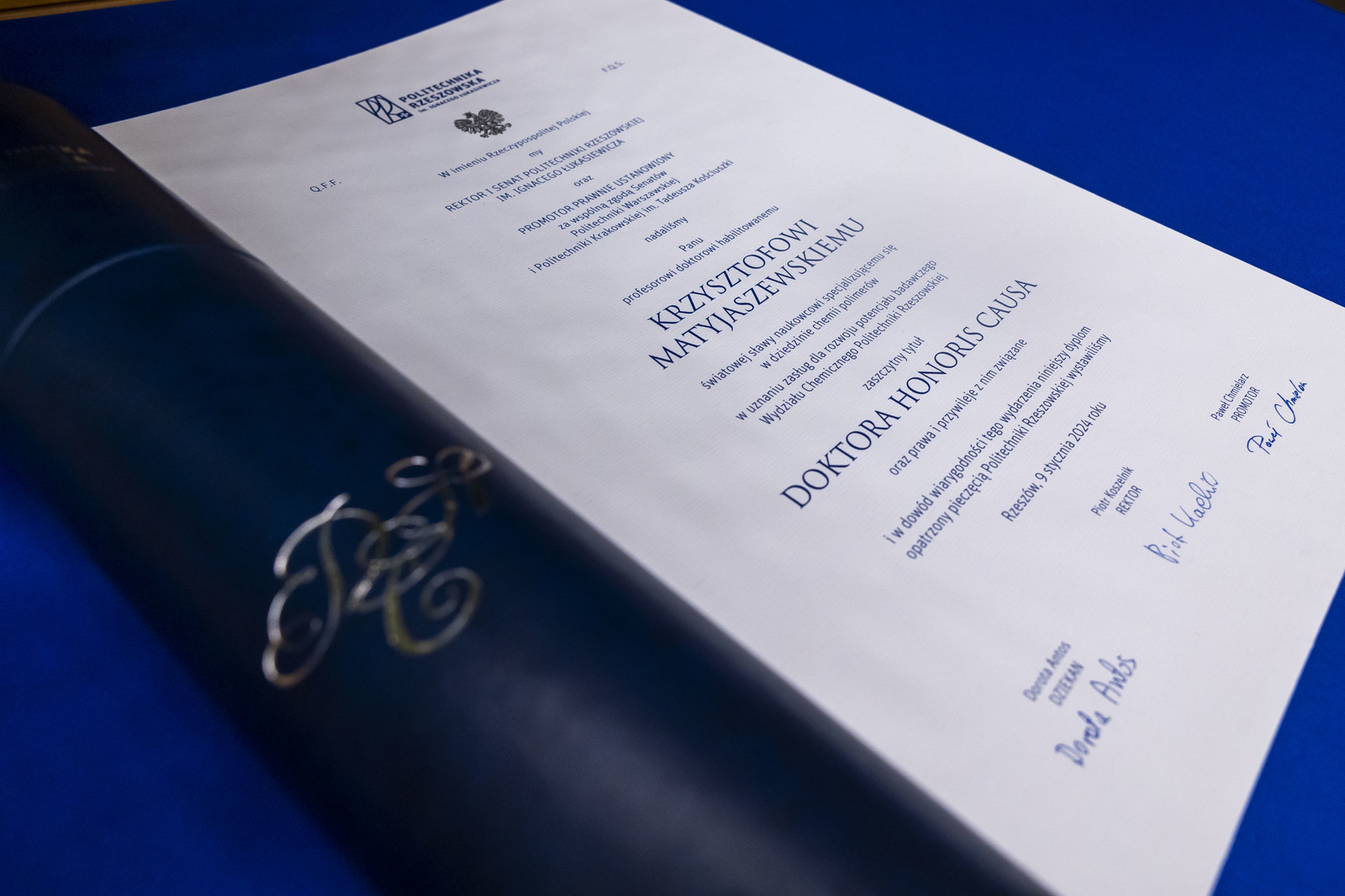 Procedura nadania akademickiego tytułu honorowego doktora honoris causa Politechniki Rzeszowskiej rozpoczęła się na wniosek Rady Wydziału Chemicznego. Senat naszej uczelni na posiedzeniu 16 stycznia 2023 r. podjął uchwałę w sprawie wszczęcia postępowania o nadanie prof. dr. hab. Krzysztofowi Matyjaszewskiemu tytułu doktora honoris causa naszej uczelni, jak również wyraził zgodę na zaopiniowanie wniosku przez Senat Politechniki Warszawskiej i Senat Politechniki Krakowskiej im. Tadeusza Kościuszki. Wyznaczono również promotora w postępowaniu w osobie prof. dr. hab. inż. Pawła Chmielarza. Senaty wyznaczonych uczelni odniosły się bardzo pozytywnie do tej inicjatywy, podkreślając w swoich opiniach wybitne dokonania prof. Krzysztofa Matyjaszewskiego z zakresu chemii i technologii polimerów i poparły wniosek o nadanie mu tytułu doktora honoris causa Politechniki Rzeszowskiej. Opinie o działalności Profesora opracowali prof. dr hab. inż. Zbigniew Florjańczyk z Politechniki Warszawskiej oraz prof. dr hab. inż. Krzysztof Pielichowski z Politechniki Krakowskiej im. Tadeusza Kościuszki.